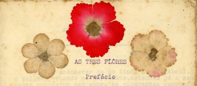 Partilha-se mais um “trabalho” de Manuel Viegas Guerreiro: o prefácio de As três flores, datado de 1932. Frisa o próprio: «escrito com tinta que me veio do coração.» A primeira folha da novela que dedicou à namorada Maria da Conceição, sua futura mulher, é ilustrada no topo pelas três flores naturais que esta lhe ofereceu...